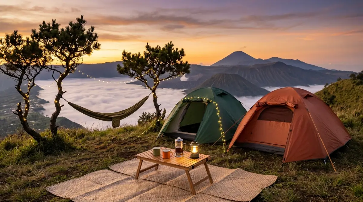 Setup Menengah (Rp2 juta – Rp5 juta): Tenda dengan desain lebih estetik, hammock berkualitas, peralatan masak enamel, pencahayaan lebih variatif.